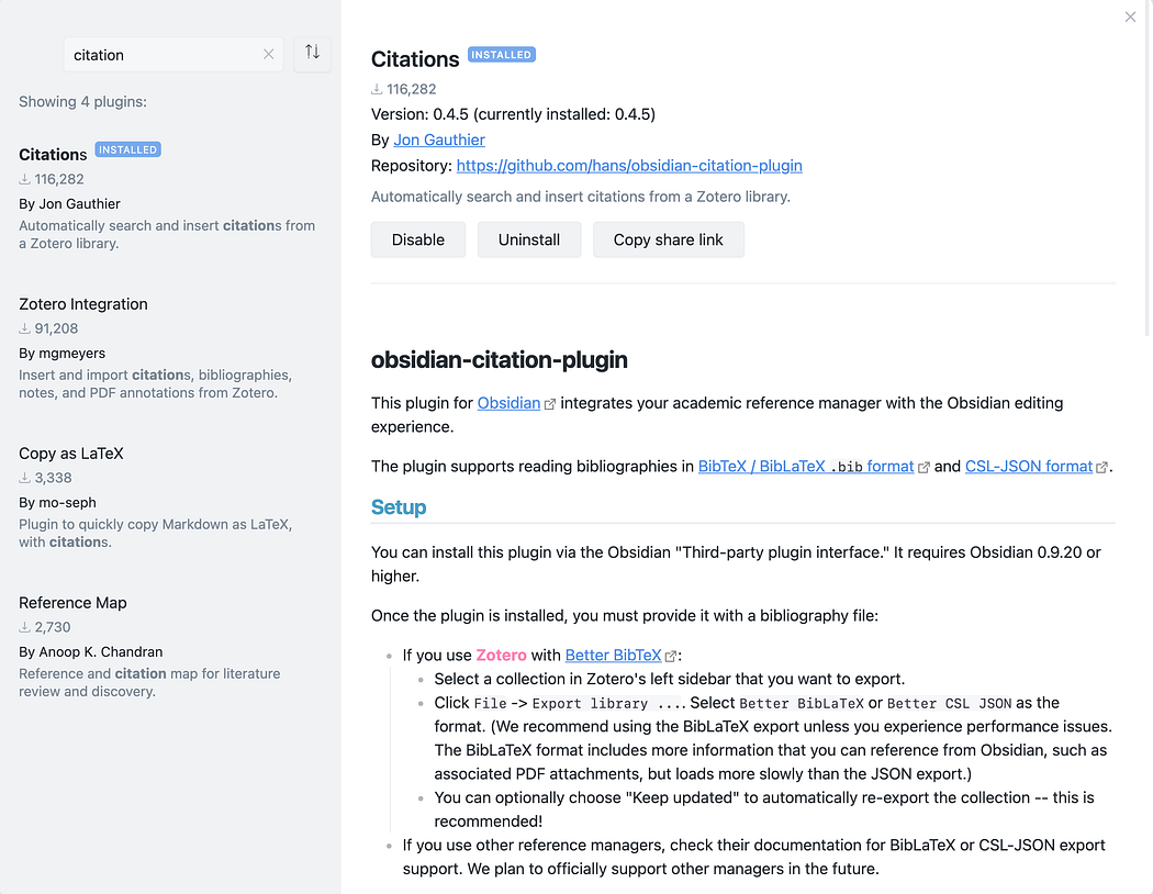 Now onto Obsidian, we will need the Citations Plugin. To install simply go to: