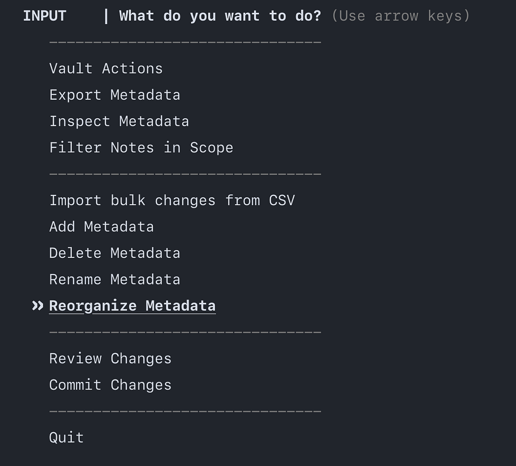 Navigate down to the "Reorganize Metadata" section and click Enter: