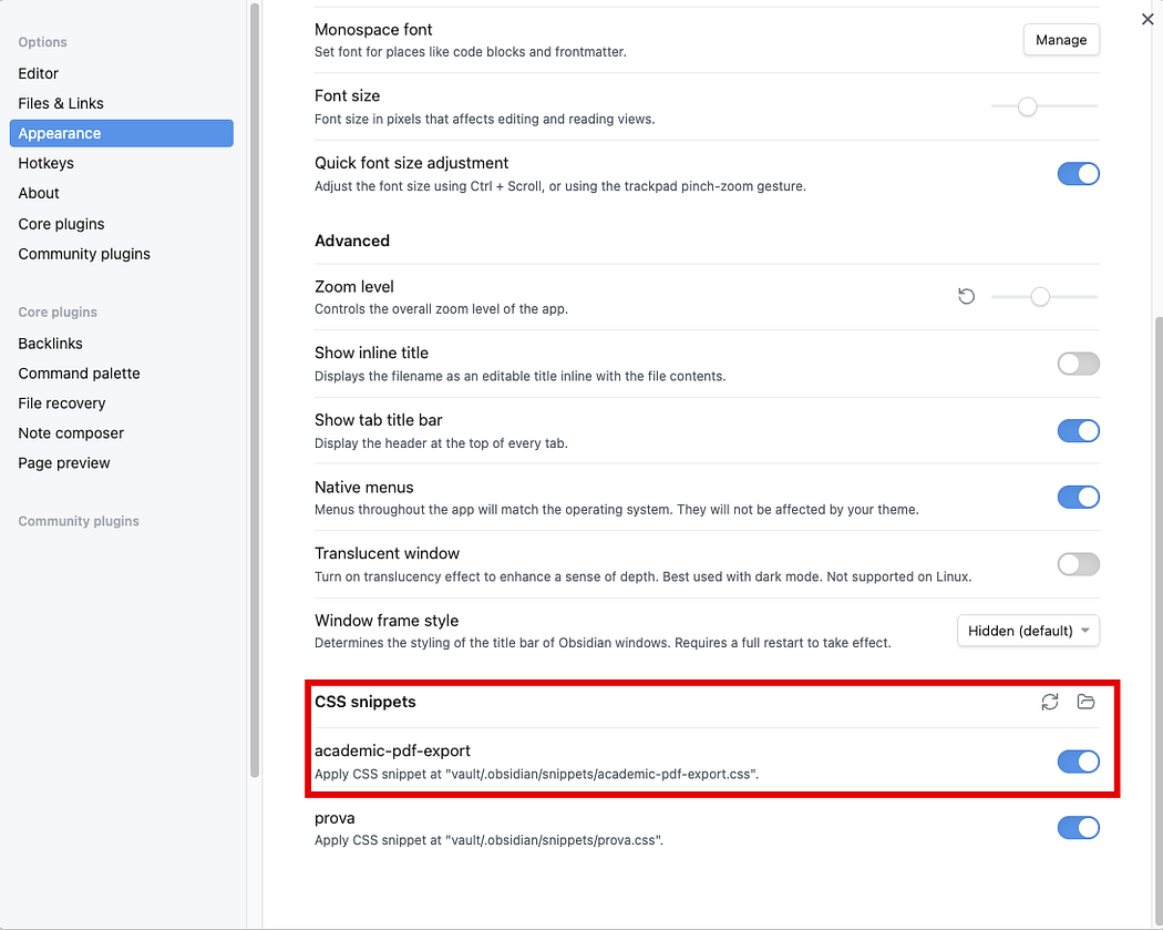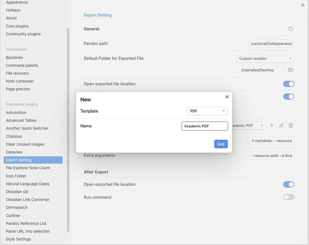 Back to Obsidian, go to Preferences > Export Settings and under Choose Setting create a new one called "Academic PDF":
