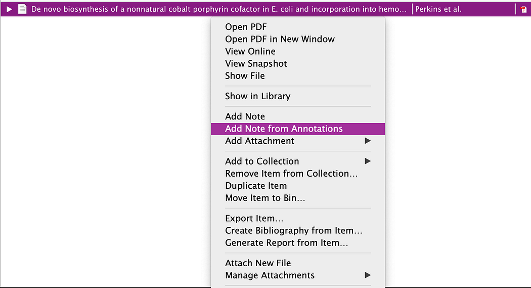 In Zotero then find the paper you have highlighted, right-click, and then select “Add Note from Annotations”: